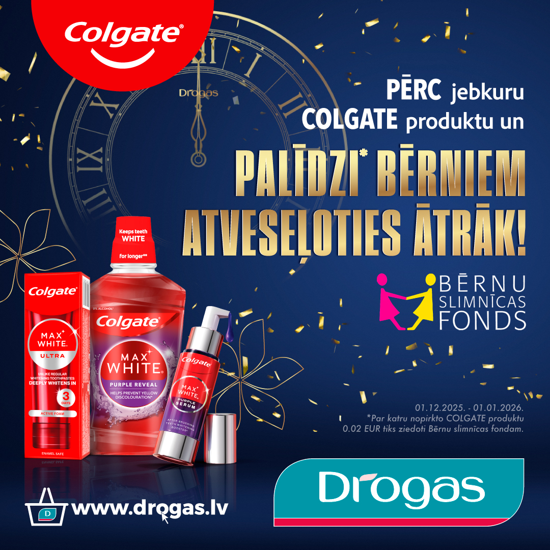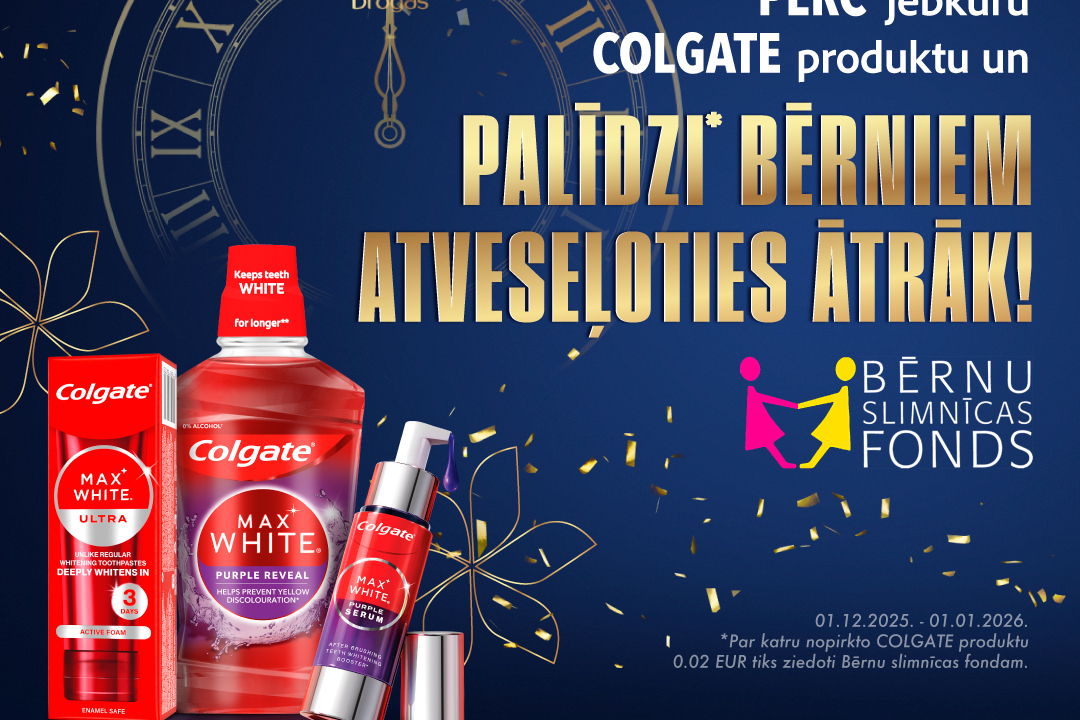 No 2025. gada 1. decembra līdz 2026. gada 1. janvārim par katru veikalos "Drogas" nopirkto "Colgate" produkta, 2 centi tiks ziedoti Bērnu slimnīcas fondam!