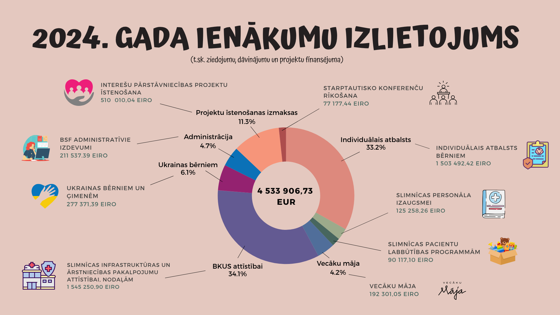 2024. gadā fonds turpināja nodrošināt individuālu palīdzību bērniem ar hroniskām un smagām veselības problēmām visā Latvijā. Gada laikā tika apmaksāti valsts neapmaksāti medikamenti, nodrošināti tehniskie palīglīdzekļi, veikta medicīnas materiālu iegāde un segti izmeklējumu izdevumi. Fonds palīdzēja arī ārkārtas gadījumos, kad bērna veselības stāvoklis vai ģimenes situācija prasīja tūlītēju rīcību.