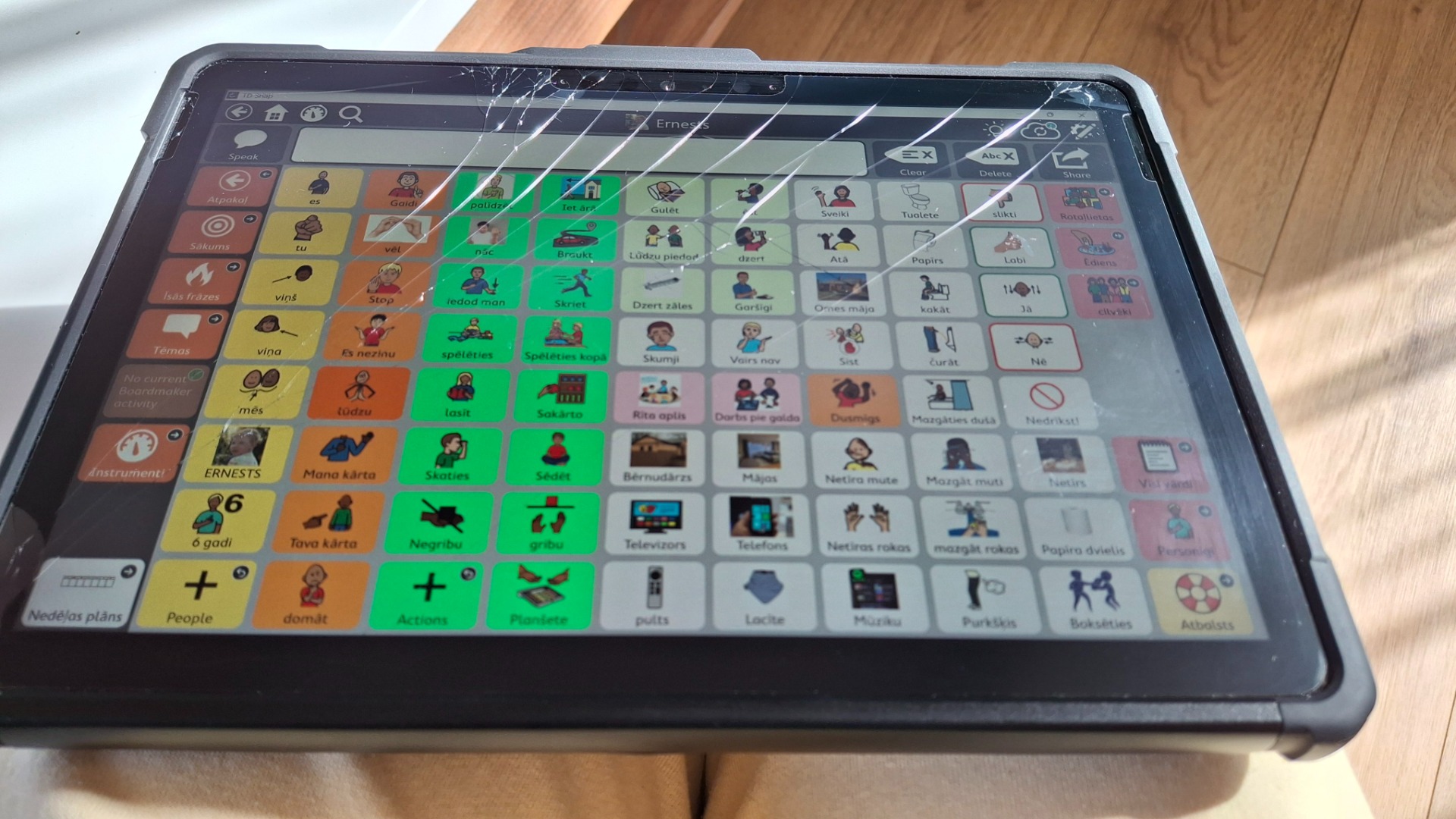Visu saturu programmā mamma veido un pielāgo bērna vajadzībām, interesējošām tēmām un aktuāliem notikumiem. Iespējas ir plašas un programma “aug” līdzi bērnam. Tomēr vecāku cerības iztikt ar parastu planšeti izrādījās naivas. Ernesta labās rokas kustību traucējumu dēļ planšete mēdz izkrist no rokām. Lai gan bija sarūpēts izturīgs vāciņš, tomēr esošajai planšetei jau dažu mēnešu laikā ir bojāts ekrāns. Turklāt planšetes baterija nenodrošina izturību visu dienu, mitrums uz ekrāna traucē funkcijām (Ernestam ir vājš lūpu slēgums, tāpēc viņš gana labi nerij siekalas), ekrāns stiprā saulē ir slikti saredzams. Nepieciešama tiešām izturīga un funkcijai piemērota ierīce, kura būtu izmantojama ilgtermiņā. Programmas pārlikšana uz citu ierīci katru reizi atkal maksā vairākus simtus eiro, jo latviešu valodas licence atkal jāiegādājas no jauna - jo tā ir derīga tikai vienai ierīcei un tikai piecus gadus. Vecāki jūt nepieciešamību iegādāties speciālo planšeti alteratīvajai komunikācijai - Tobii Dynavox I-110.