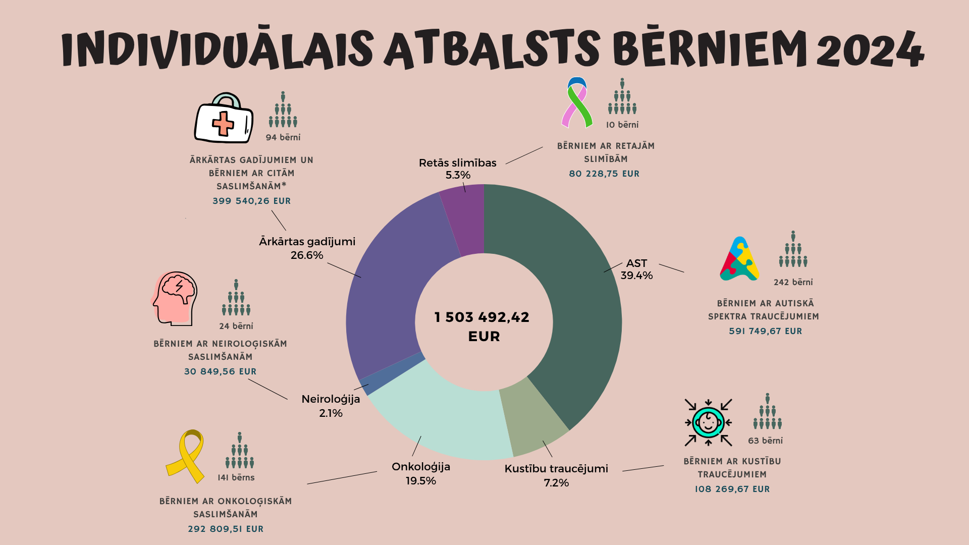 2024. gadā fonds turpināja nodrošināt individuālu palīdzību bērniem ar hroniskām un smagām veselības problēmām visā Latvijā. Gada laikā tika apmaksāti valsts neapmaksāti medikamenti, nodrošināti tehniskie palīglīdzekļi, veikta medicīnas materiālu iegāde un segti izmeklējumu izdevumi. Fonds palīdzēja arī ārkārtas gadījumos, kad bērna veselības stāvoklis vai ģimenes situācija prasīja tūlītēju rīcību.