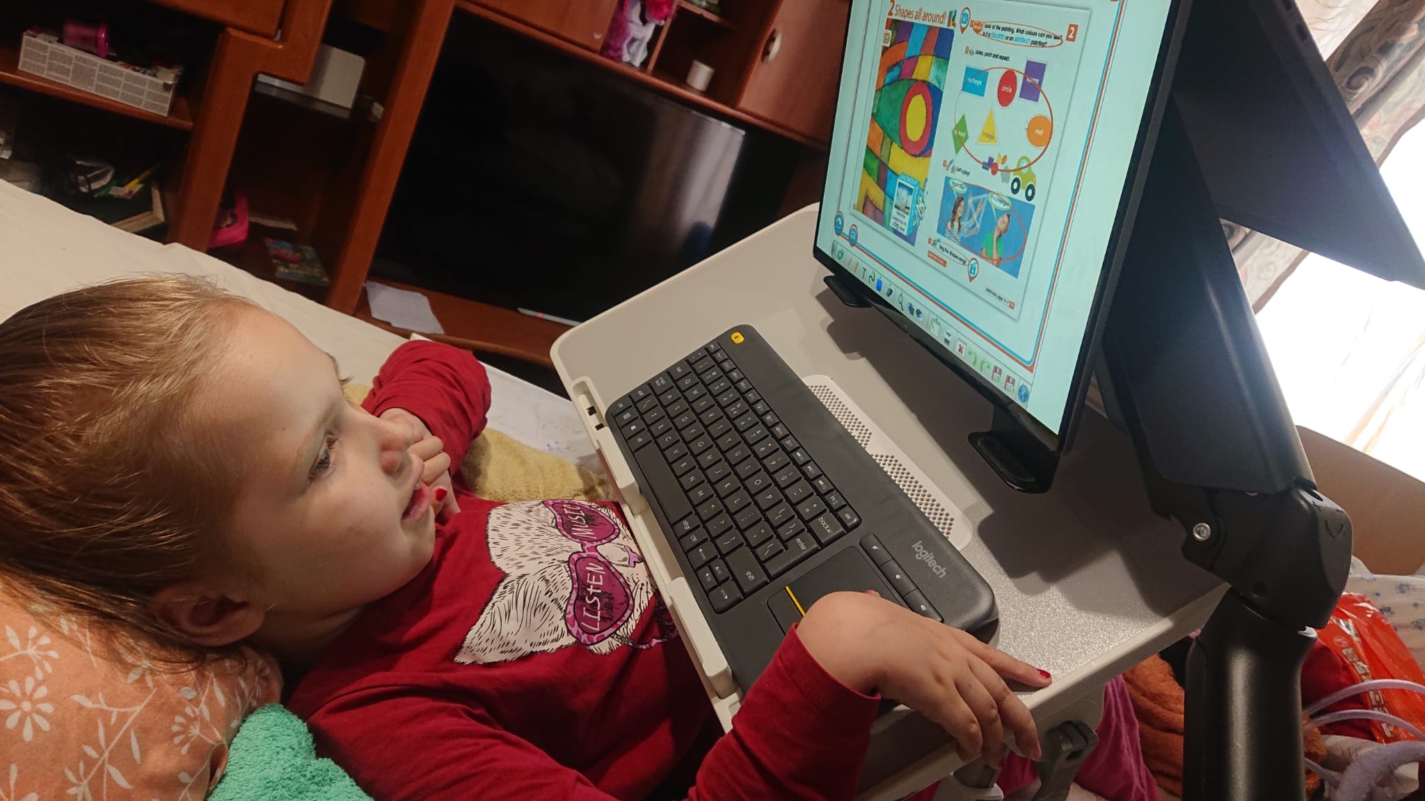 Arinas mācību vide ir iekārtota - meitene jau aktīvi darbojas ar īpaši piemēroto portatīvo datoru, kuram ir skārienjūtīgs ekrāns, bezvadu klaviatūra un speciāli stiprinājumu, ar ko novietot datoru virs gultas. "Liels paldies visiem ziedotājiem par Arinas sapņa piepildīšanu! Viņa ir ļoti laimīga!" raksta Arinas mamma.
